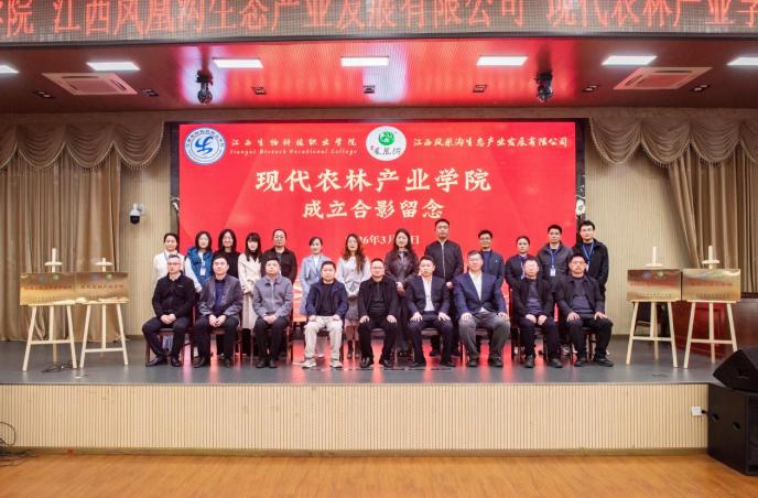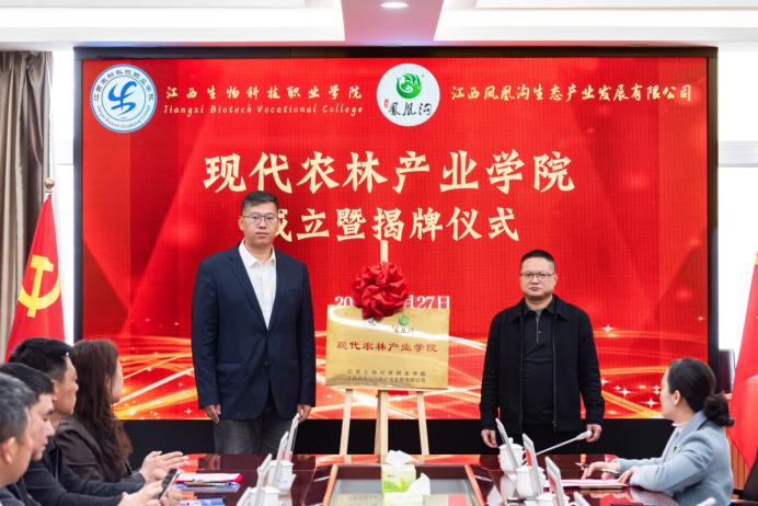 为深入贯彻落实江西省农业强省建设战略部署,深化产教融合、推进校企协同育人,精准对接地方现代农业与生态产业高质量发展需求,3月27日,我院与江西凤凰沟生态产业发展有限公司共建的“现代农林产业学院”成立暨揭牌仪式在学院举行。江西省赣农投资发展集团有限公司党委委员、副总经理李洪波,江西省农业科学院蔬菜花卉研究所二级研究员、江西省蔬菜产业技术体系首席专家罗绍春,中国教育发展战略学会产教融合专业委员会副秘书长余贵泉,江西凤凰沟生态产业发展有限公司执行总经理赵润成、副总经理薛晓魁,学院党委书记姚丽华,党委委员、副院长富国裕、詹绍成、王加文及双方相关部门负责人、教师代表共同出席。